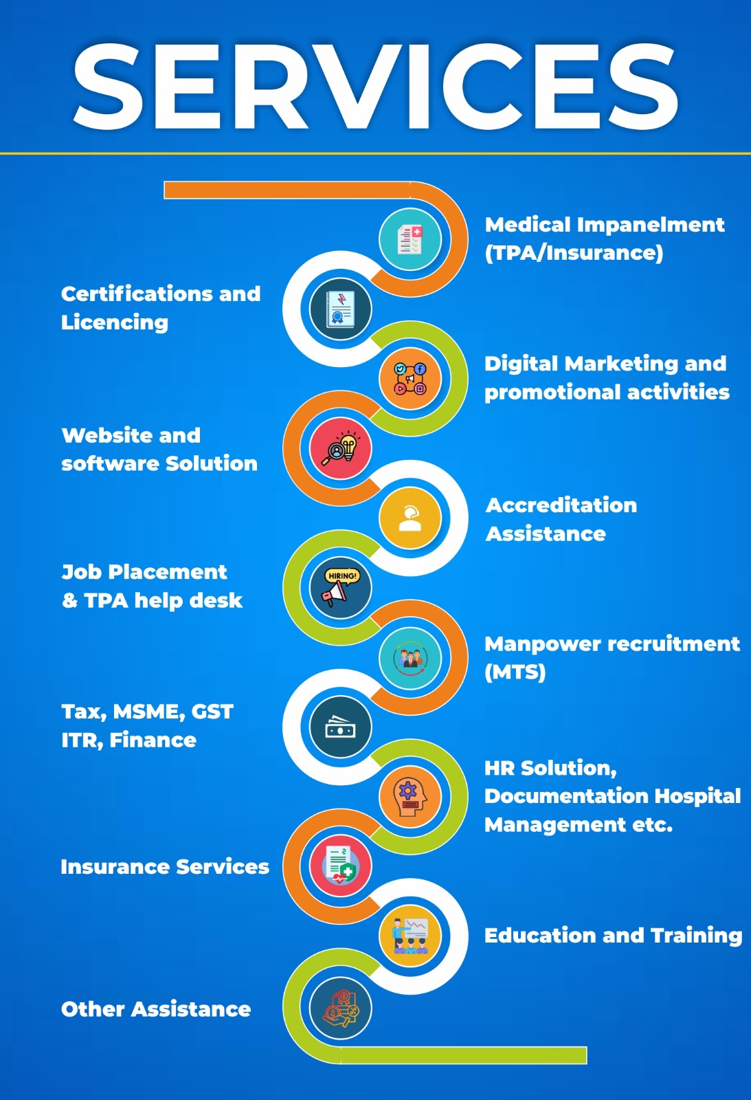 Our team is dedicated to provide our best services to each and every client in a complete professional and beneficial manner. We provide solution in terms of Home Health Care, Empanelment, Digital Marketing and promotional activities, NABH accreditation, providing TPA help desk, Manpower recruitment (MTS), Certifications, Licencing, ISO, MSME, HR Solution, Construction Work, Software solution and other services.